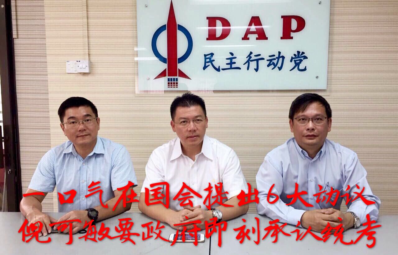 倪可敏今日召开新闻发布会时指出,今年国会会议将从3月6日开始召开至4月6日,为期一个月。为了维护公众利益,他巳经根据议会长规向国会提交六项书面动议,其中包括要求政府即刻承认独中统考文凭,结束华社长达45年漫长的等待。倪可敏指出,国会议长丹斯里班迪卡阿敏上周表明他的个人立场支持承认统考,因此他已经致函议长要求他坐言起行批准他的动议,勿再敷衍华社。倪可敏強调,雪州、梹州及砂州三个州政府已经承认统考,因此国阵中央政府不承认统考只会导致人才流失,是一种愚蠢的行为。要求成立皇委会查1 MDB倪可敏提出的其他五项动议包括要求政府成立皇家调查委员会调查1MDB丑闻,同时追回失窃的百亿公款。为了打击贪污,他也同时要求首相纳吉与全体内阁部长向国会公布个人财产。选区划分须依「一人一票」原则倪可敏说,为了争取乾净公平选举,他也要求国会通过动议,规定所有选区划分选民人数不可以相差超过15%,藉此以落实“一人一票”的精神。倪氏表示,为了维护民主,他也向国会动议即刻检讨2016年国家安全理亊会法令,避免有人隻手遮天、扼杀民主。出席今日记者会的行动党領袖包括州组织秘书兼保閣亞三州议员郑国霖及后廊区州议员廖泰义。