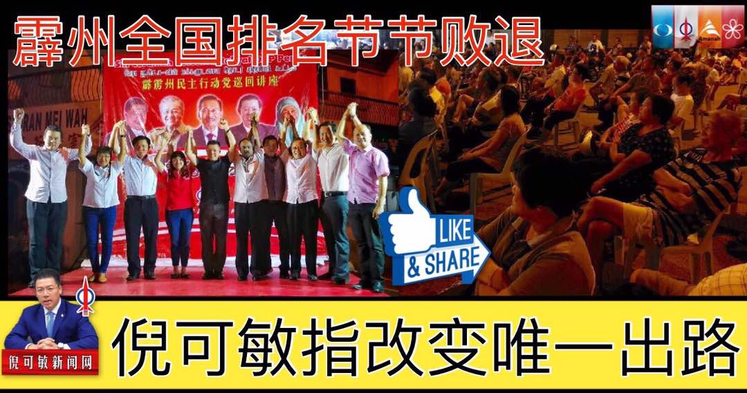 霹州行动党主席倪可敏今日指出,不管州务大臣拿督赞比里如何否认,霹州在国阵冶理下全国排名节节败退已经是不爭的亊实,人民唯有改变换政府才是唯一的出路!