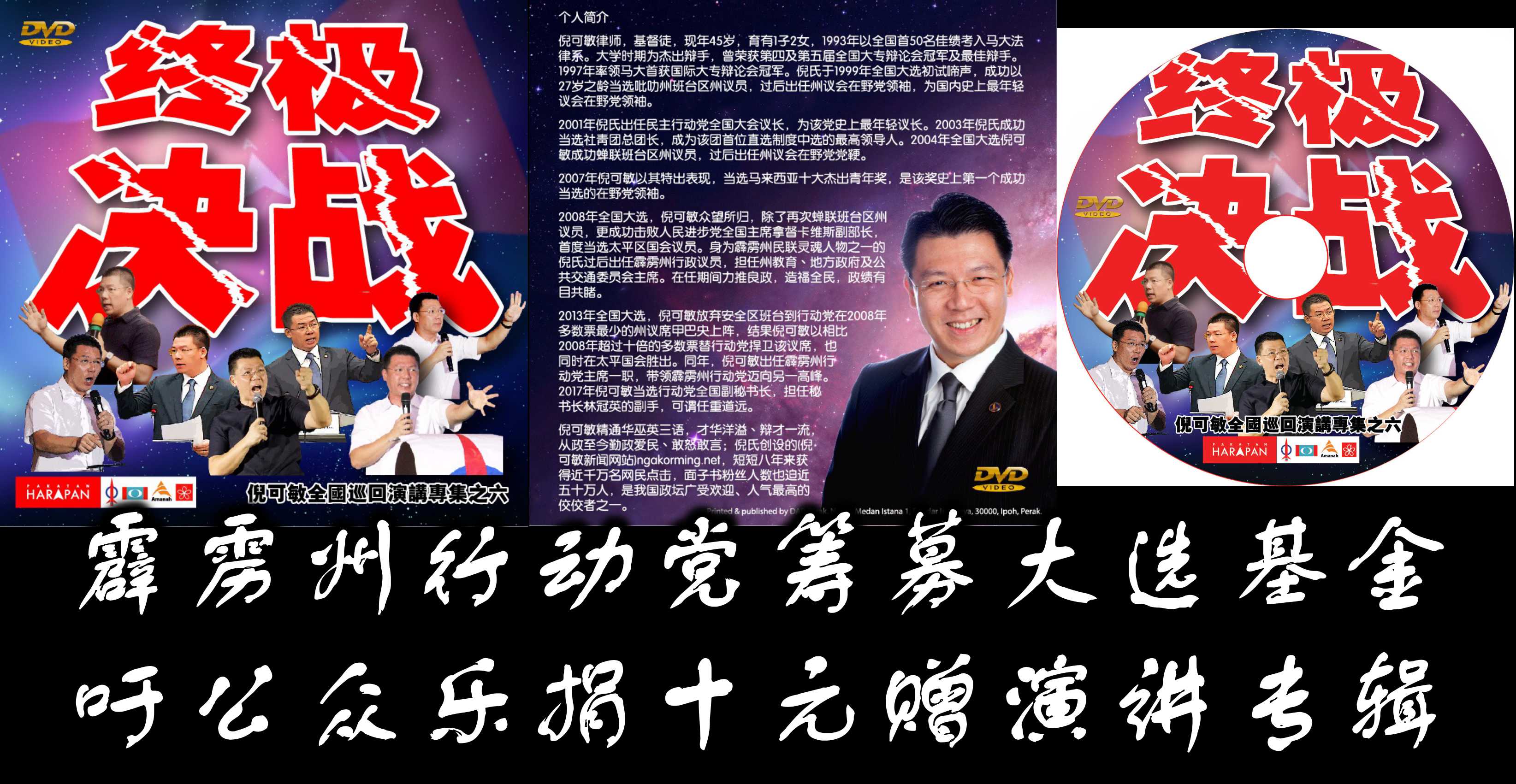 与此同时,为了回馈广大群众的支持,任何热心公众凡捐助十令吉或以上皆可以获得由该党出版的倪可敏经典演讲专辑第六集“终极决战”光碟一片。此光碟收录了我国十大杰出青年、行动党名咀兼全国副秘书长倪可敏在巡廻全国各地精彩的演讲片段,同时摘录倪氏在国州议会经典的辩论场面及许多经典政治笑话,内容丰富多彩,绝对不容错过。凡有意乐捐索取专辑的人士欢迎致电霹州行动党总部 tel : 05-2531532 或者联系总部执行秘书廖慧珊 tel : 012-5266003。