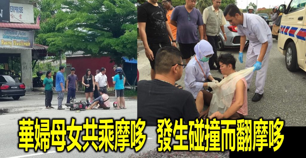(太平8日訊) 華婦母女共乘摩哆,途中與輛轎車發生碰撞而翻摩哆,造成母女受傷入院治傷。這起車禍于今日下午2時20分左右,發生在太平新板路,靠近古打交通燈的店屋前。據了解,事發時,該名40余歲的華婦駕著摩哆,載其10余歲的女兒,從太平朝新板方向行駛,豈料抵事發地點時,同方向行駛的一輛轎車突然拐彎要轉進店屋內,而華婦則來不及閃避,結果摩哆與該輛轎車碰撞。