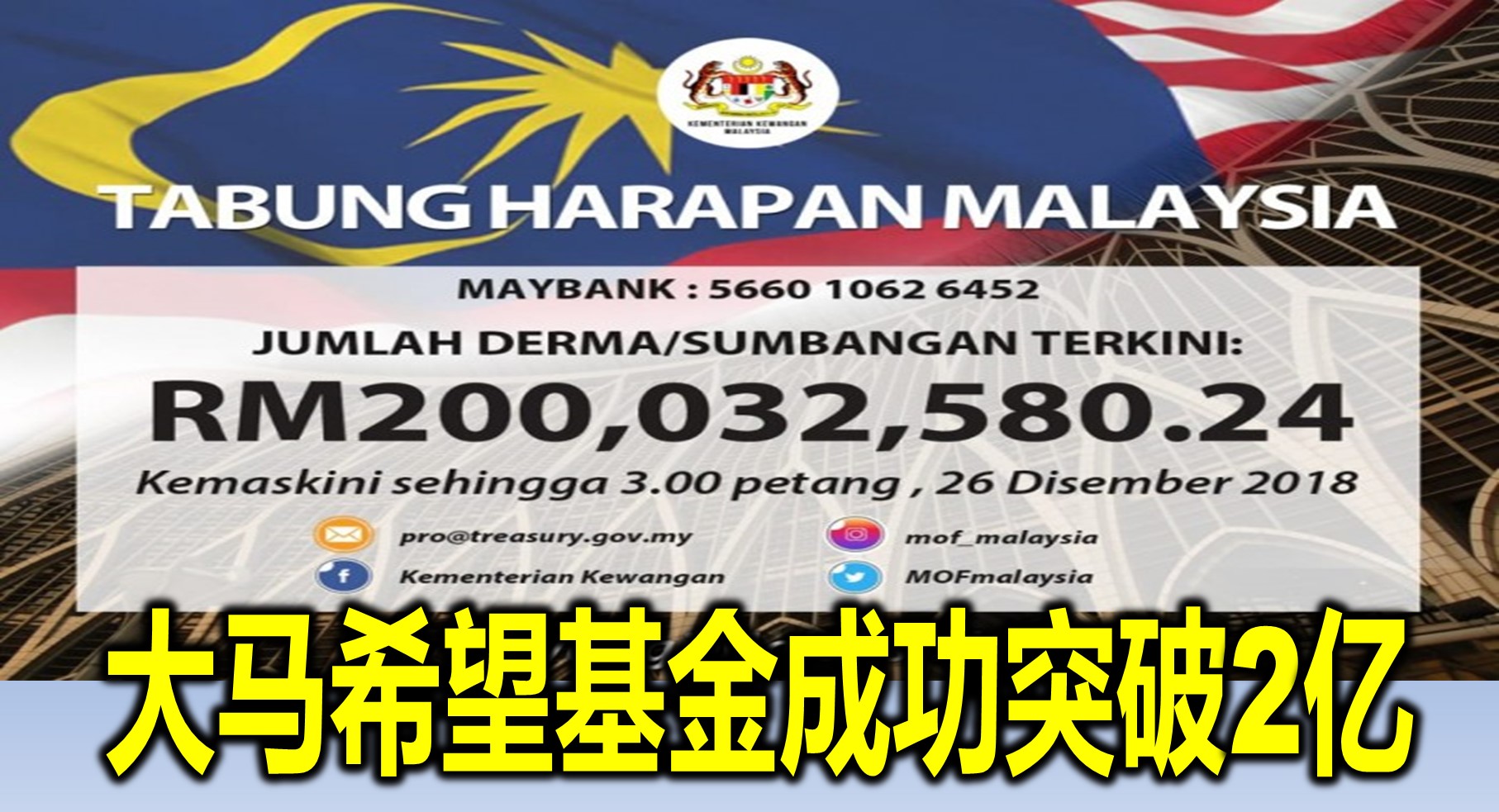 截至12月26日下午3时,大马希望基金成功突破2亿令吉!根据財政部在面子书官网今天贴图,显示该基金截至今午3时,已筹获2亿3万2580令吉24仙。財政部林冠英日前宣佈,今年5月30日设立的大马希望基金,將会在本月31日停止收取款项,而总审计局也会对此审计,確保筹获的基金是在透明於诚信的制度下管理。如今在距离本月31日停止接收款项不到一星期的时间,大马希望基金成功突破2亿令吉。財政部在面子书讚扬大马人民,指大家都是爱国的大马人,热心捐款救国,愿意帮助国家减轻债务。