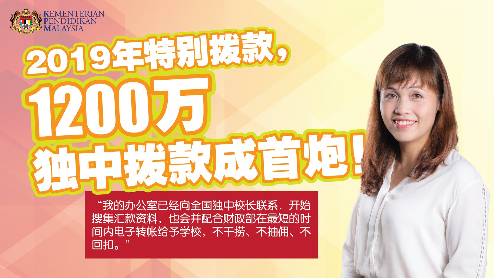 教育部副部长张念群表示,2019年的特别拨款,会优先处理1200万拨款予全国华文独立中学,这次的发展拨款,将充作学校基建和维修用途。“我的办公室已经向全国独中校长联系,开始搜集汇款资料,也会配合财政部在最短的时间内电子转帐给予学校,不干捞、不抽佣、不回扣。”