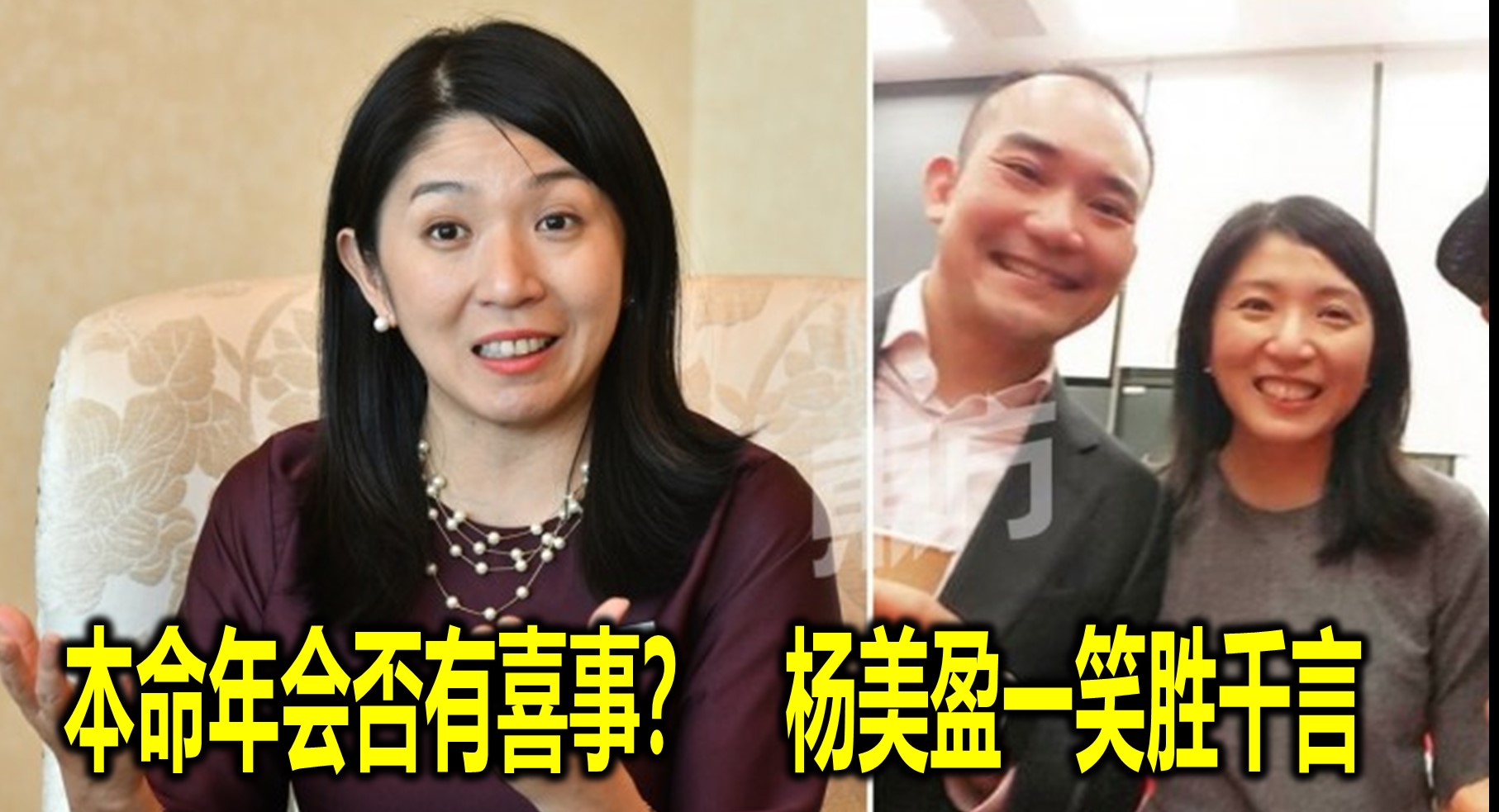 记者问:「本命年会有喜事吗?」杨美盈一直以笑来回应,甚至还笑著对记者说:「你不可以问我这个的问题吧……哈哈哈。」当记者继续追问时,笑得很开心的杨美盈不愿正面回应,她笑答:「这个不可以答吧……这个改天再討论吧……到时候就会懂的了。」去年12月,经友人在面子面上传有关杨美盈与IOI產业首席执行员李耀升的合照后,杨美盈的恋情曝光。虽然她一直没有证实,但她也没有对此做出否认。