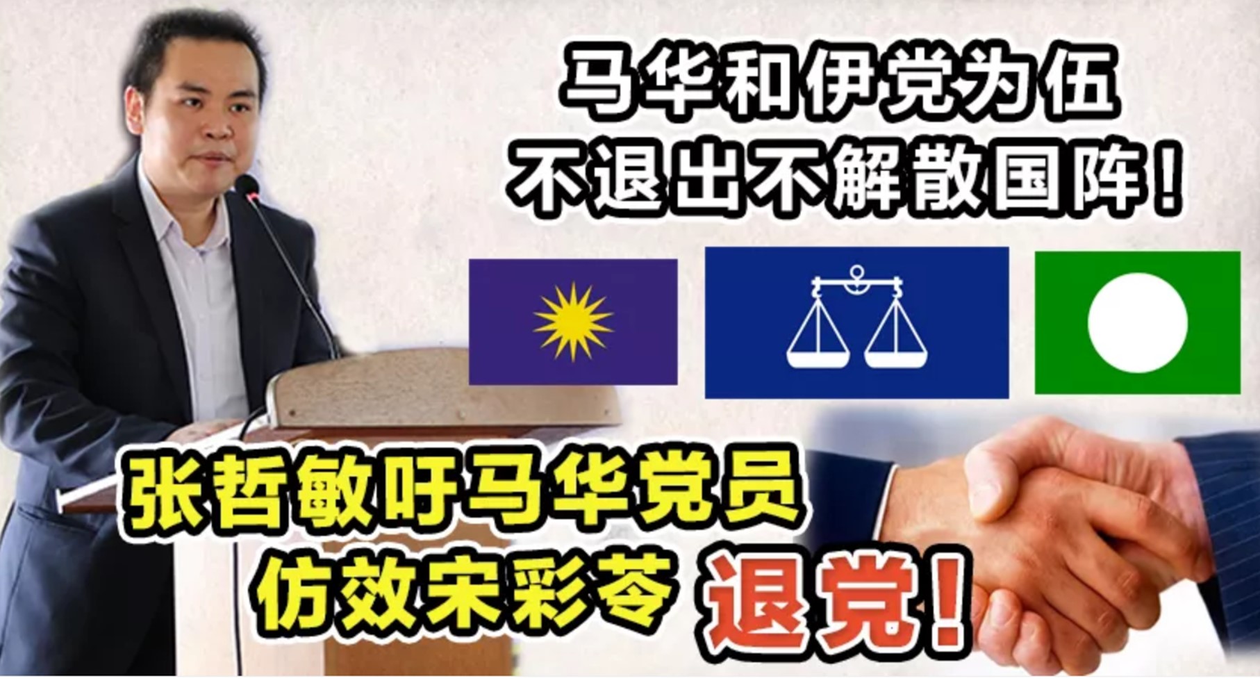 马华前妇女组中委宋彩苓因马华无法推动国阵解散,且续留国阵一事,宣布退党,以示不满。民主行动党霹雳州宣传秘书张哲敏今日呼吁马华党员仿效宋彩苓集体退党以示抗议和捍卫尊严。他说马华现任领导层已经是毫无底线的向巫统妥协,从马华前总会长廖中莱的“开除巫统”论,