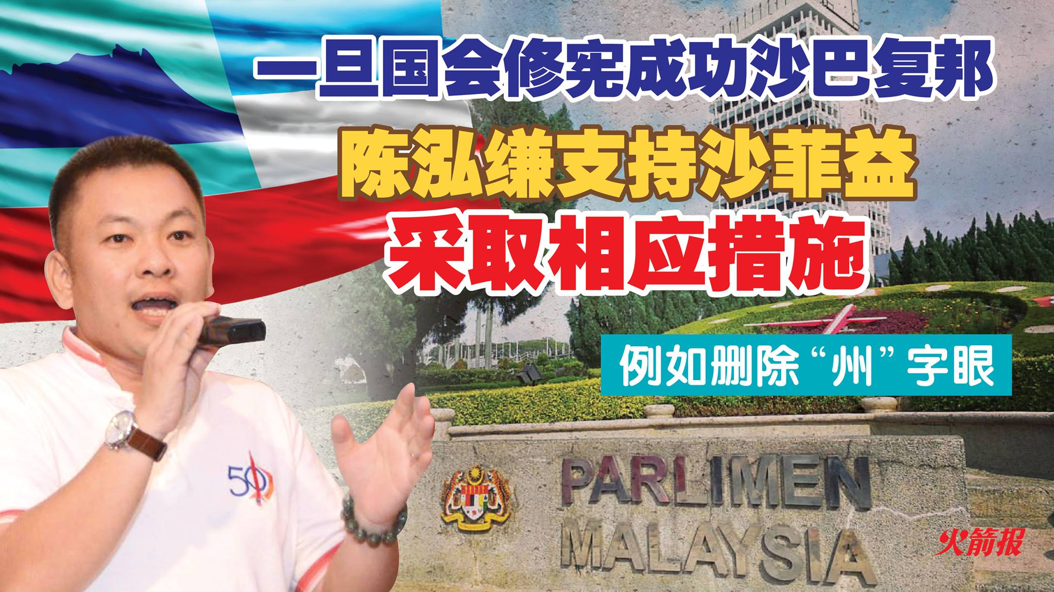沙巴行动党秘书兼亚庇区国会议员陈泓缣2019年3月18日文告:亚庇区国会议员陈泓缣支持沙巴首长沙菲益的拟议,一旦联邦国会成功修宪,沙巴“弃州复邦”,州政府也需要采取相应措施,在所有官方文件上删除“negeri”字眼。也是沙巴行动党秘书陈泓缣发表文告表示,这一季的国会会议,