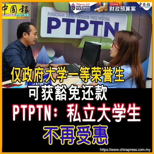 相关新闻>>2026年财政预算案|中低收入家庭学生 获一等荣誉学位 免还PTPTN贷款