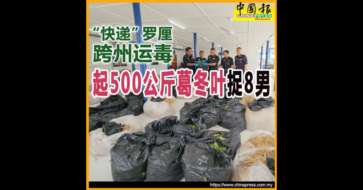 “经检查,发现23个包裹内都是新鲜的葛冬叶,重量509.7公斤,市值约2万400令吉,一旦被加工提炼成液体,料可满足计3500人的‘解瘾’需求,从中牟获5万2500令吉丰厚收入。”