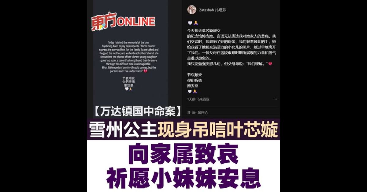(吉隆坡19日讯)雪州公主东姑扎塔莎周五(17日)前往富贵生命馆吊唁“万达镇国中命案”女死者叶芯嫙,并向死者父母和家属表达哀悼。