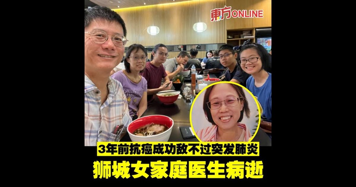 (新加坡20日讯)3年前抗癌成功,却敌不过突发肺炎,女家庭医生病发一周后撒手人寰,终年54岁。
