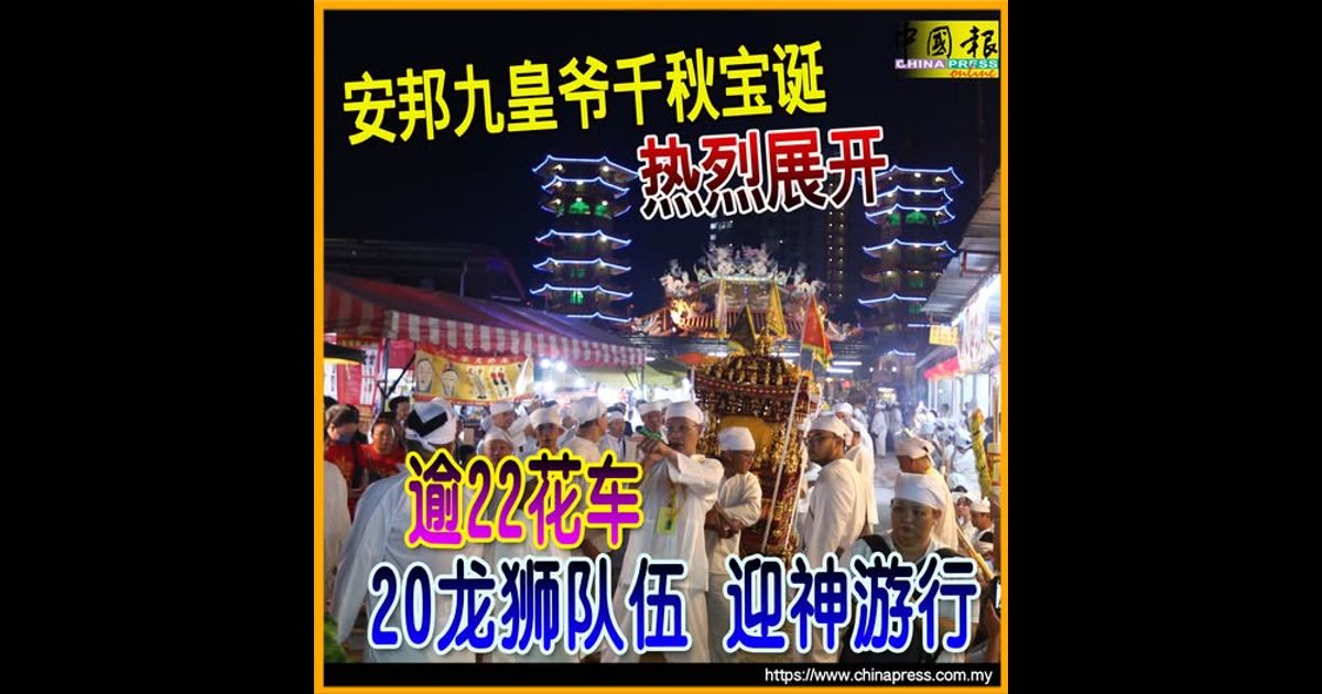 (安邦20日讯)一年一度的九皇爷千秋宝诞庆典今晚正式开始,九皇爷安邦南天宫出动超过22支花车队伍,以及超过20支龙狮队伍,在数千名善信的跟随下,展开恭接九皇爷晋殿仪式,为隆重庆典掀开序幕。
