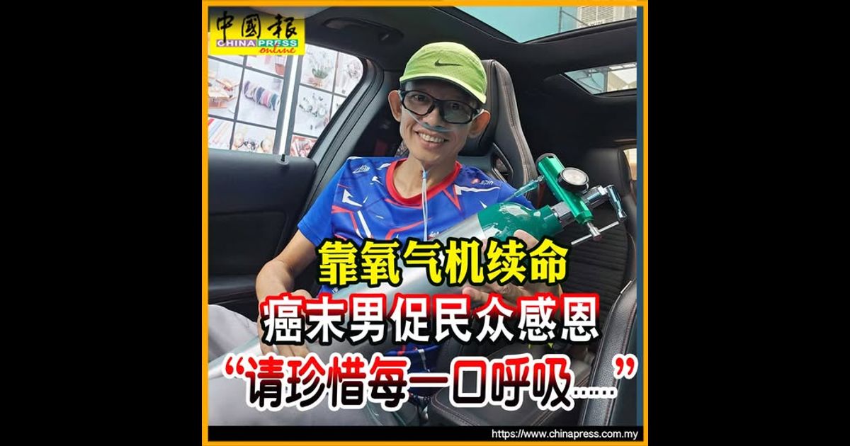 纳斯里马迪来自霹雳州怡保,是一名积极接受治疗的癌患,他在社媒分享道,他目前如在家中就靠氧气机供氧,外出时则需要携带氧气桶。