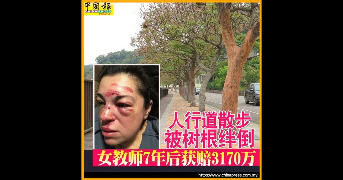 (华盛顿22日综合电)美国加州一名女老师走在路上时,脚被人行道上凸起的树根绊倒,导致她脸部朝下直接撞到地面,严重的撞击导致手腕、手肘和鼻骨骨折,嘴唇还因为断裂牙齿留下伤口。 在与市政府长达7年的诉讼后,这名女教师如今获得750万美元(约3170万8207令吉)赔偿金。