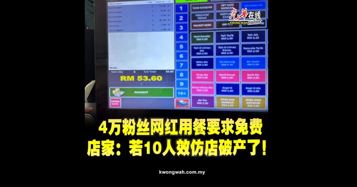 tikTok账号拥有4万名粉丝的男子,日前到槟城著名扁担饭餐馆用餐时,试图以“我是网红”为由要求免单,却遭到业者婉拒。业者称,若10个人到来,要求免单,该店不是破产。