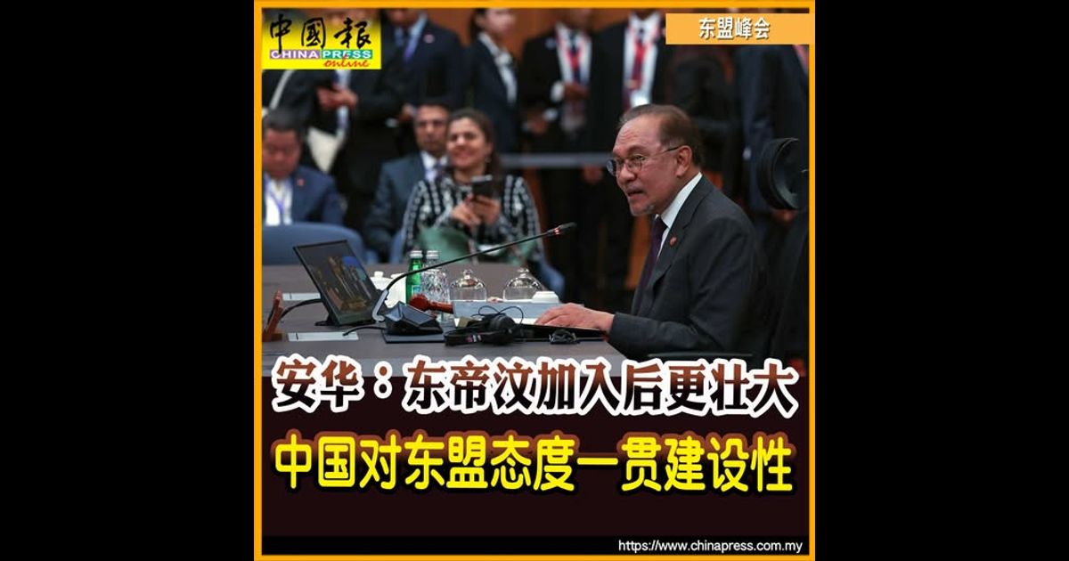(吉隆坡28日讯)首相拿督斯里安华说,随着东帝汶加入东盟后,这意味东盟拥有11个成员国,尽管意见要一致既不可能,也非必要,但相信,大家都共同认可中国在与东盟互动中展现的长期、一贯且建设性的态度。