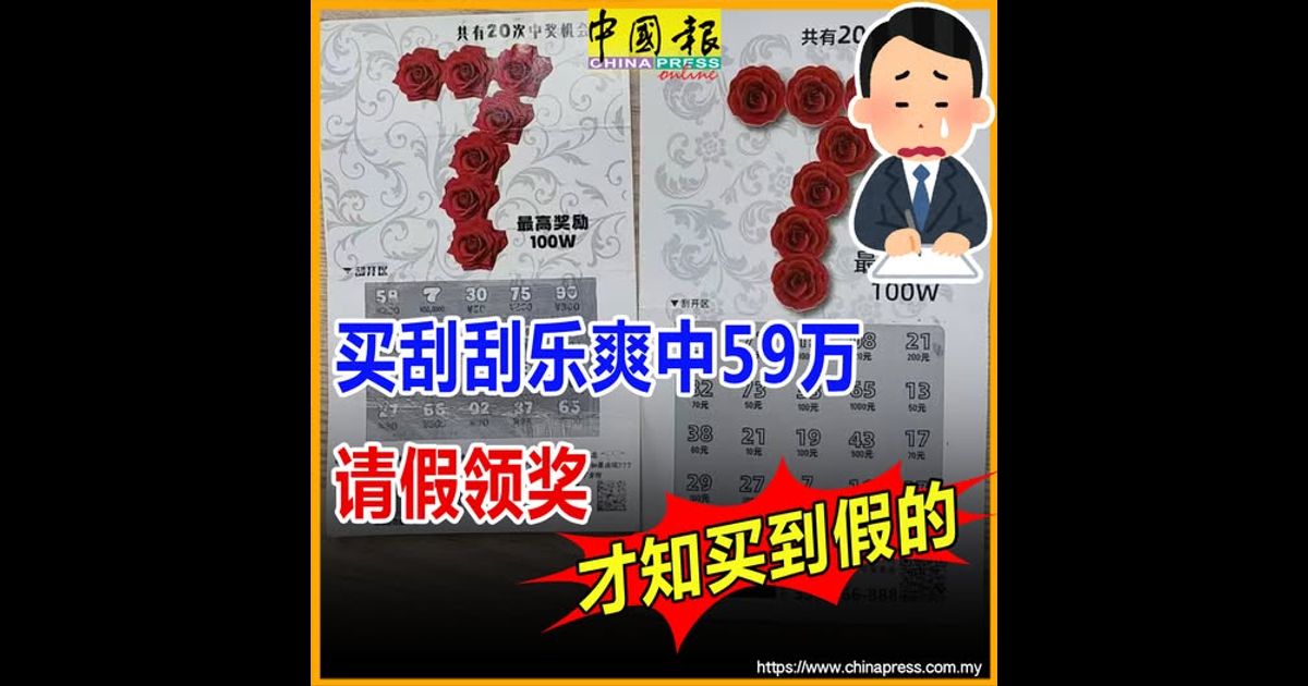 (北京28日综合电)中国江苏省苏州市一名上班族,近日在地铁站旁的流动摊贩处,购买刮刮乐,惊喜刮出了100万人民币(约59万1614令吉)的大奖,为此特地请假前去领奖,没想到他买的是“道具刮刮乐”。