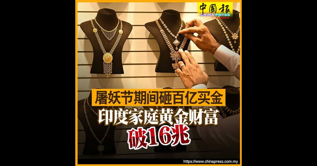 (新德里28日讯)在屠妖节期间,印度人砸了上兆卢比狂扫黄金,根据大摩预估, 印度家庭持有的黄金财富估计为3兆8000万美元(约16兆令吉),相等于国内生产总值(GDP)的88.8%。
