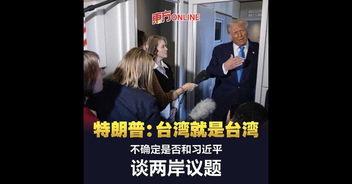 台湾中央社报导,特朗普搭乘“空军一号”从日本飞往韩国途中接受随行媒体访问。被问及预期习近平将如何在台湾议题上施压,特朗普回应表示,不确定是否会谈到台湾议题,习近平也许会想问,“但其实没什么好问的,台湾就是台湾”。