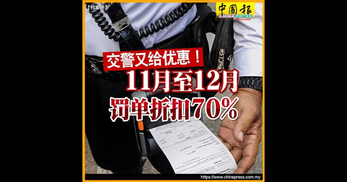 (关丹30日讯)大马皇家警察宣布,从11月1日至12月30日,全国各地交通罚单可享有高达70%折扣优惠,民众受促把握机会,尽早缴清罚款。