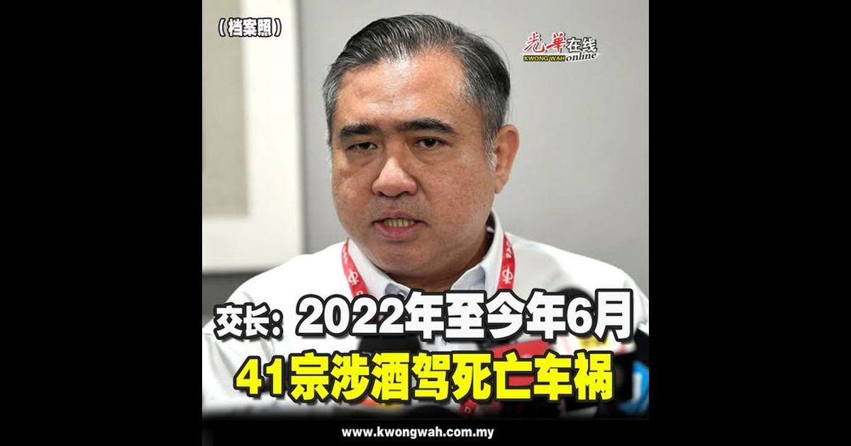交通部长陆兆福指出,2022年至今年6月共有41宗车祸死亡案例与酒驾有关。