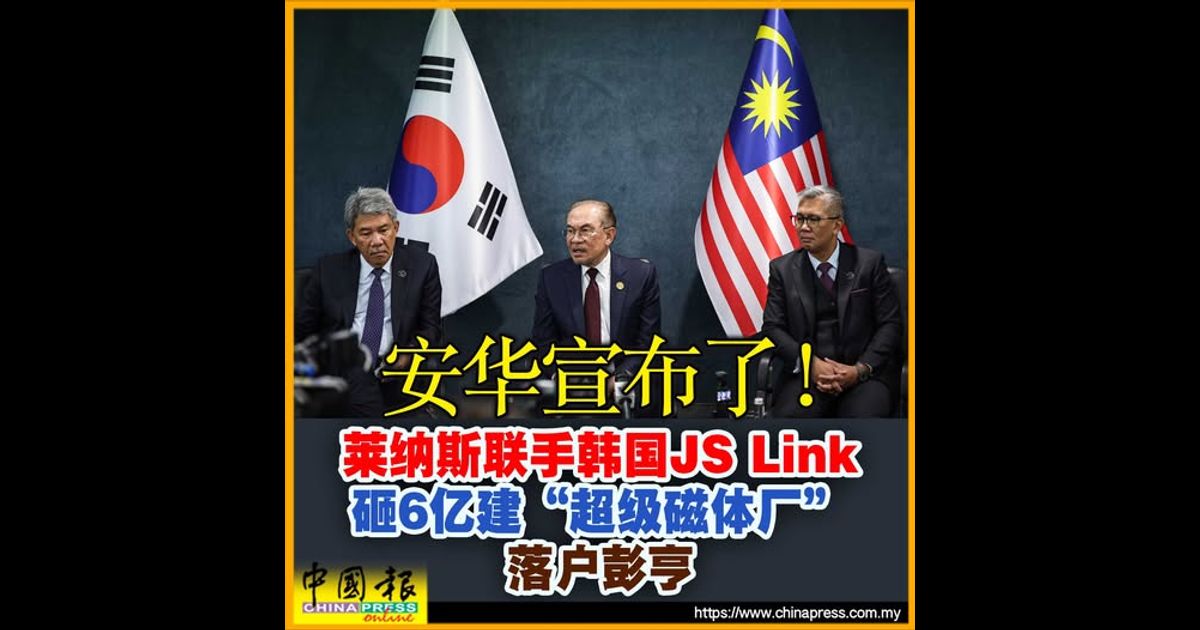 (韩国.庆州1日讯)韩国稀土永磁体制造商JS Link和大马莱纳斯,将在彭亨州开发价值6亿令吉的“超级磁体”制造厂项目,这被视为有望提升马来西亚在稀土下游业的地位,并创造新的发展潜力。