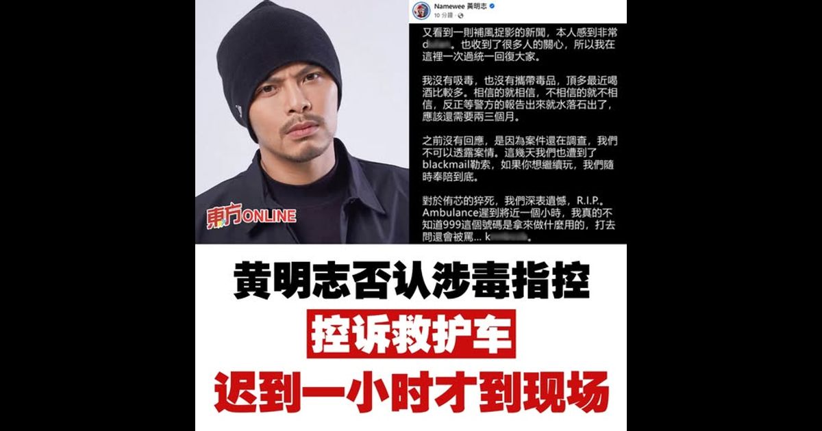 黄明志今午在面子书专页发布帖文,称社交媒体今日流传一篇涉毒案新闻后收到了很多人的关心,为解决粉丝心中疑惑才会发布帖文统一回复。