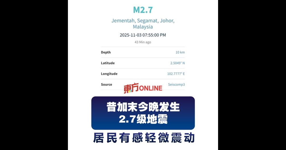 (昔加末3日讯)柔佛州昔加末利民达今晚7时55分发生2.7级地震,当地居民都感觉轻微震动。
