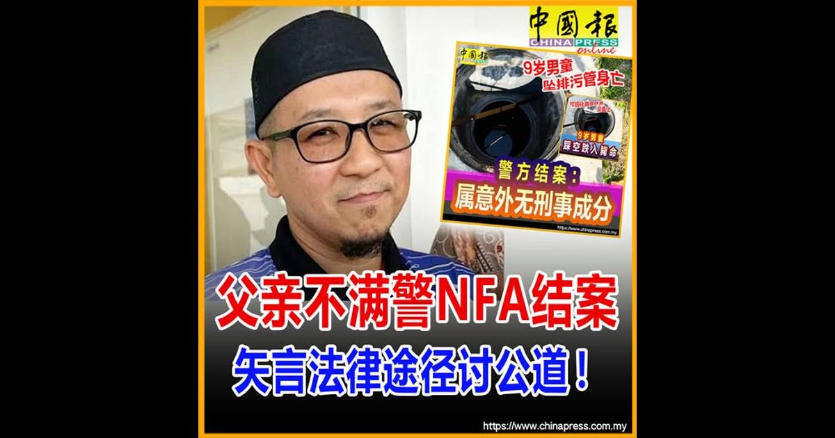 (芙蓉3日讯)“9岁男童踩空坠入排污管身亡”案;男童父亲兼学校家协主席凯鲁里扎坦言,他与家人对于警方将此案列为NFA(无进一步行动)结案,感到不满,矢言要通过法律行径追究到底!