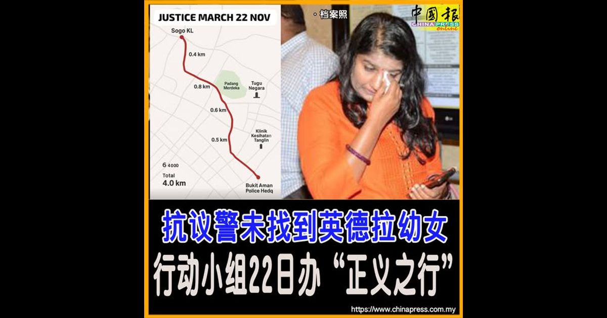 (吉隆坡4日讯)英德拉行动小组(INGAT)宣布,将于11月22日举行“正义之行”活动,以抗议警方仍未找到英德拉幼女柏拉莎娜下落。