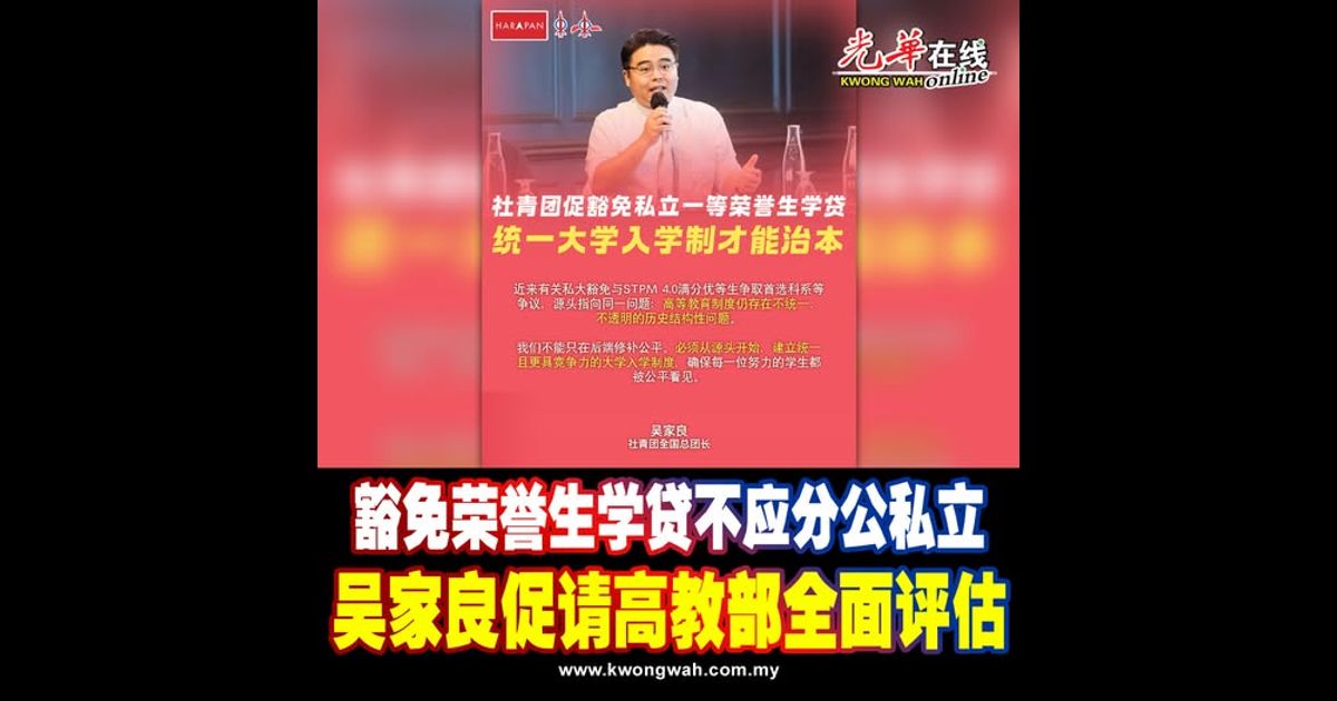 民主行动党社青团全国总团长吴家良促请高教部全面评估私立大学一等荣誉学位毕业生豁免PTPTN贷款政策,认为这方向正确,也符合教育公平精神。