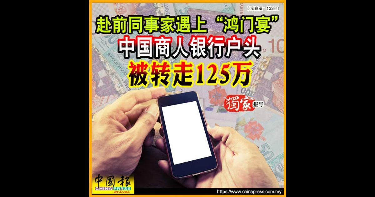 《中国报》探悉,中国籍事主(37岁,商人)报案时声称,事发当时,他独自出外与中国籍前同事、前同事妻子及友人等11人,一起享用晚餐,随后被前同事献议,前往后者住家探访。据悉,事主较后乘坐前同事司机所安排的车子,抵达位上述住家后,看见在场者共有12人包括前同事,他较后入屋探查,并按照指示进入其中一间房间后,惊见房内有4名蒙面分持刀子和木棍的同籍男子。据了解,事主随后被命令及威胁交出手机和钱包, 在场的前同事的私人保镖取走事主手机后,在3小时内,将其银行户头的款项分3次转走,并且取走钱包的300令吉现金。