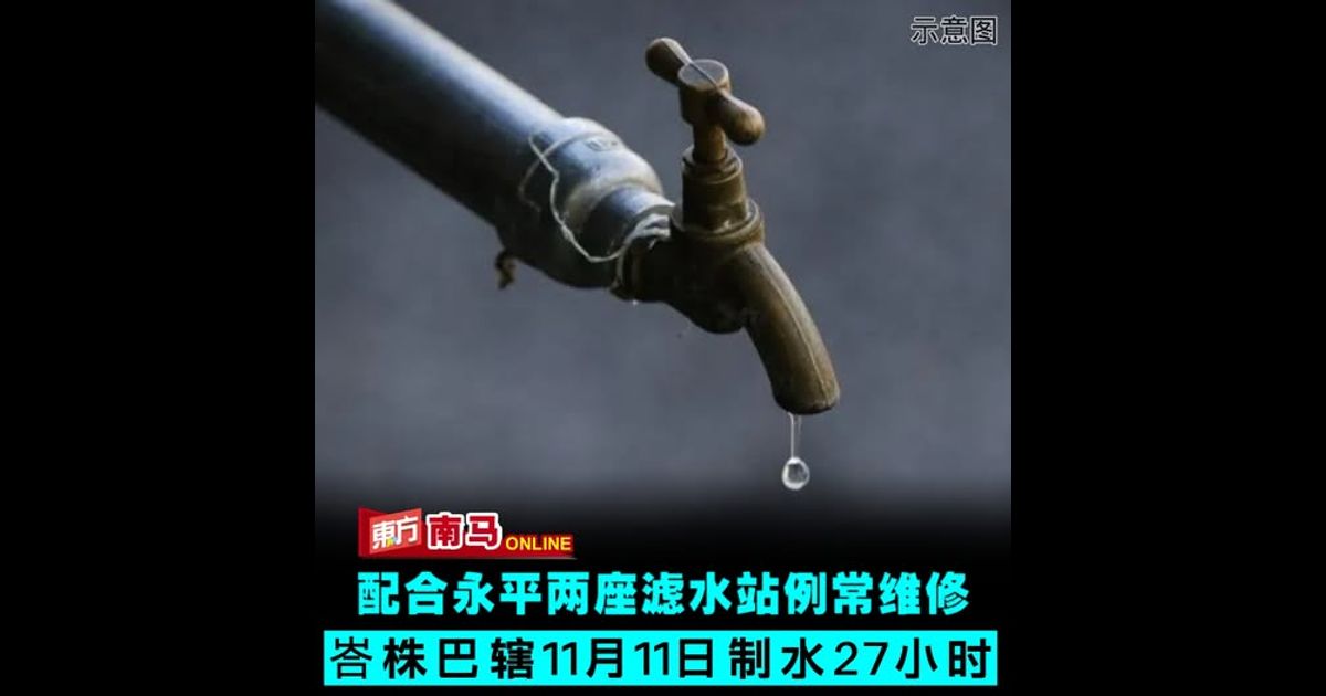 (峇株巴辖6日讯) 峇株巴辖多个地区将于本月11日(周二)上午9时,至本月12日(周三)中午12时,制水长达27小时,受影响用户受促储备足够的水备用,节约用水。