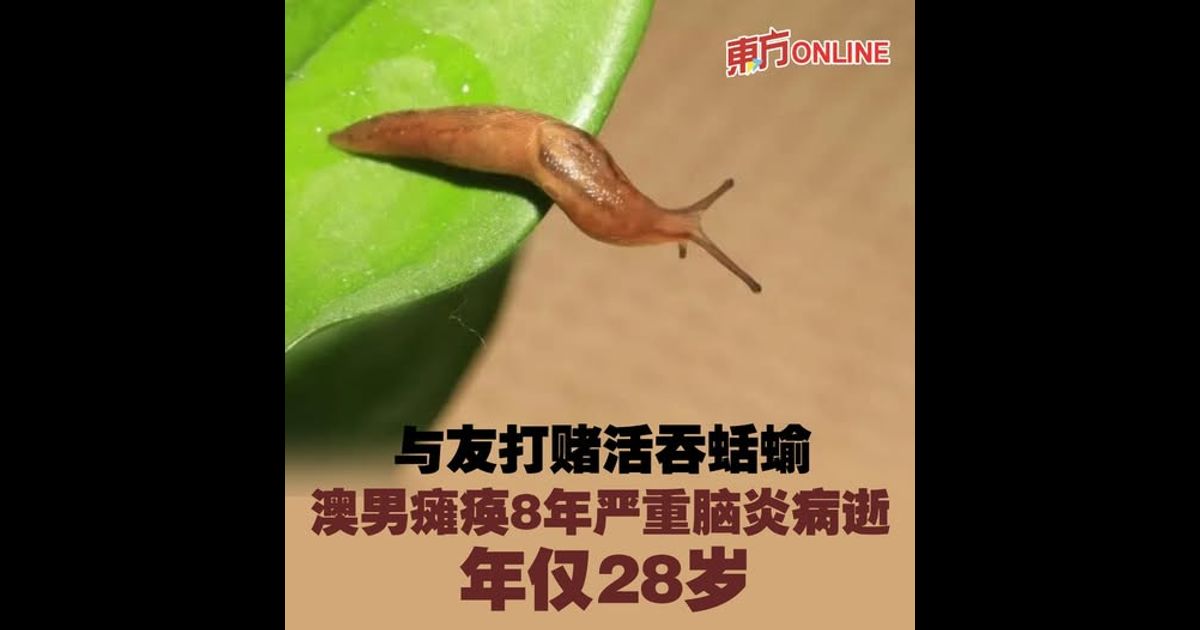 (堪培拉8日讯)澳洲一名青年在生日派对和朋友打赌吃下一只蛞蝓,没想到却被寄生虫入侵脑部导致终身瘫痪,最终因并发症离世,得年28岁。