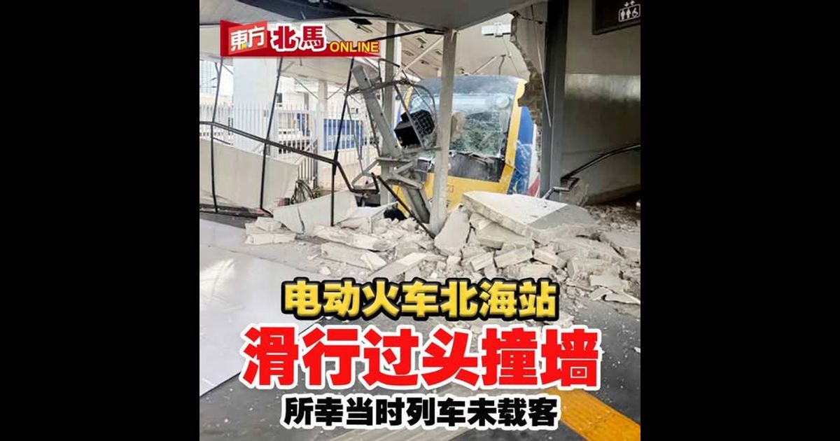 (北海8日讯)今早一列通勤电动火车(KTM Komuter)在北海火车站滑行过头,导致车头撞破第4月台尽头的墙面,所幸当时列车未载客,无人伤亡。