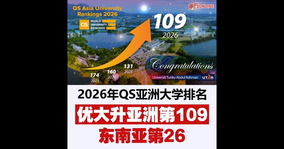 (吉隆坡10日讯)拉曼大学(优大;UTAR)在高等教育领域持续进步,并再创里程碑式的成就,在刚公布的“2026年QS亚洲大学排名”中,拉曼大学位居亚洲第109位、东南亚第26位。