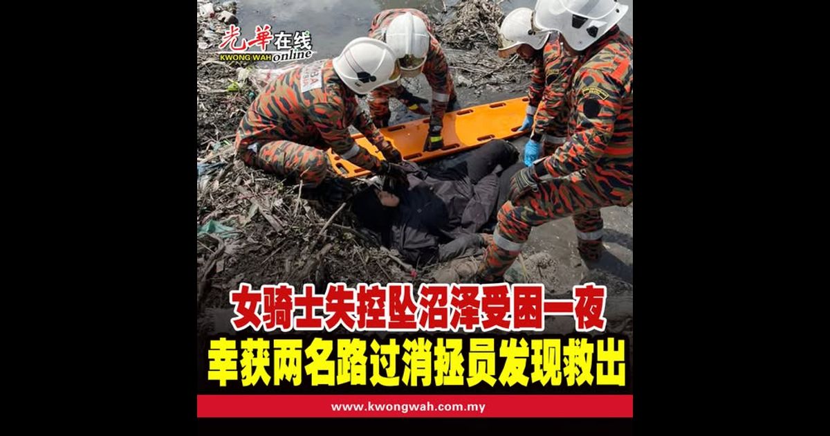 疑骑摩托车失控连人带车坠入沼泽地受困一整夜,女骑士命大,被刚好经过该处的两名消拯员凭敏锐的救援直觉发现其踪迹。