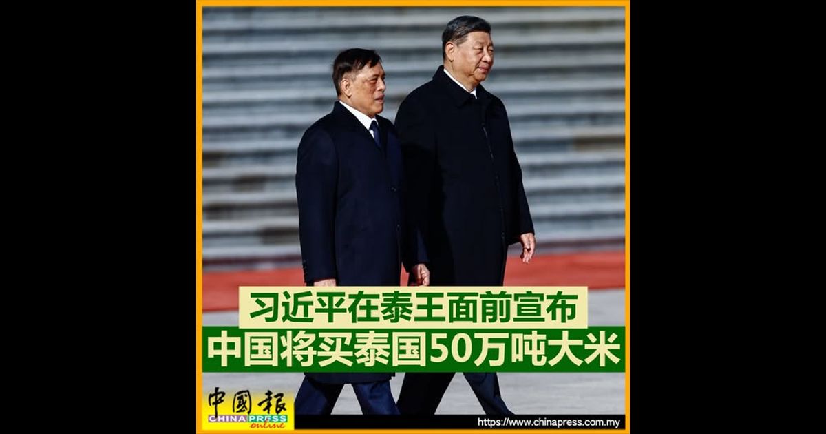 (曼谷14日综合电)中国国家主席习近平在泰王瓦吉拉隆功面前,宣布中国将购买泰国50万吨大米。