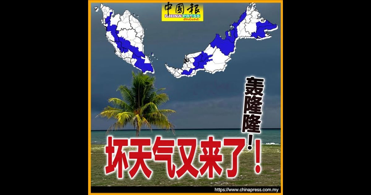 该局预测,吉打(华玲、居林和万拉峇鲁)、霹雳(拉律马登司南马、江沙、近打、金宝、马登巴冷和慕亚林)、彭亨(金马仑高原、劳勿、文冬、淡马鲁、百乐和云冰)、雪兰莪(乌鲁雪兰莪、鹅唛和乌鲁冷岳)、吉隆坡、森美兰(日叻务)、柔佛(昔加末、峇株巴辖、居銮、笨珍、古来、哥打丁宜和新山),会有雷雨、豪雨及刮强风。