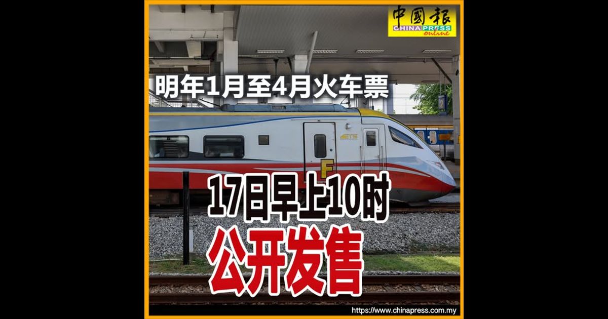 (吉隆坡15日讯)马来亚铁道公司(KTMB)指出,适用于明年1月1日至4月30日行程的双轨电动火车(ETS)和城市服务电动火车(KTM Intercity)车票,将于下周一(17 日)上午10时起向公众开放发售。