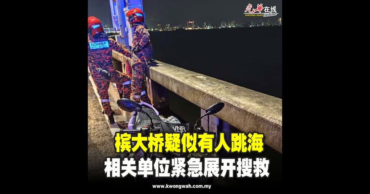大桥上留下雅马哈摩托车。槟城第一大桥周日傍晚发生疑似跳海事件,一名身份未明人士被公众目击从桥上跳入海中,相关单位已展开紧急搜救行动。