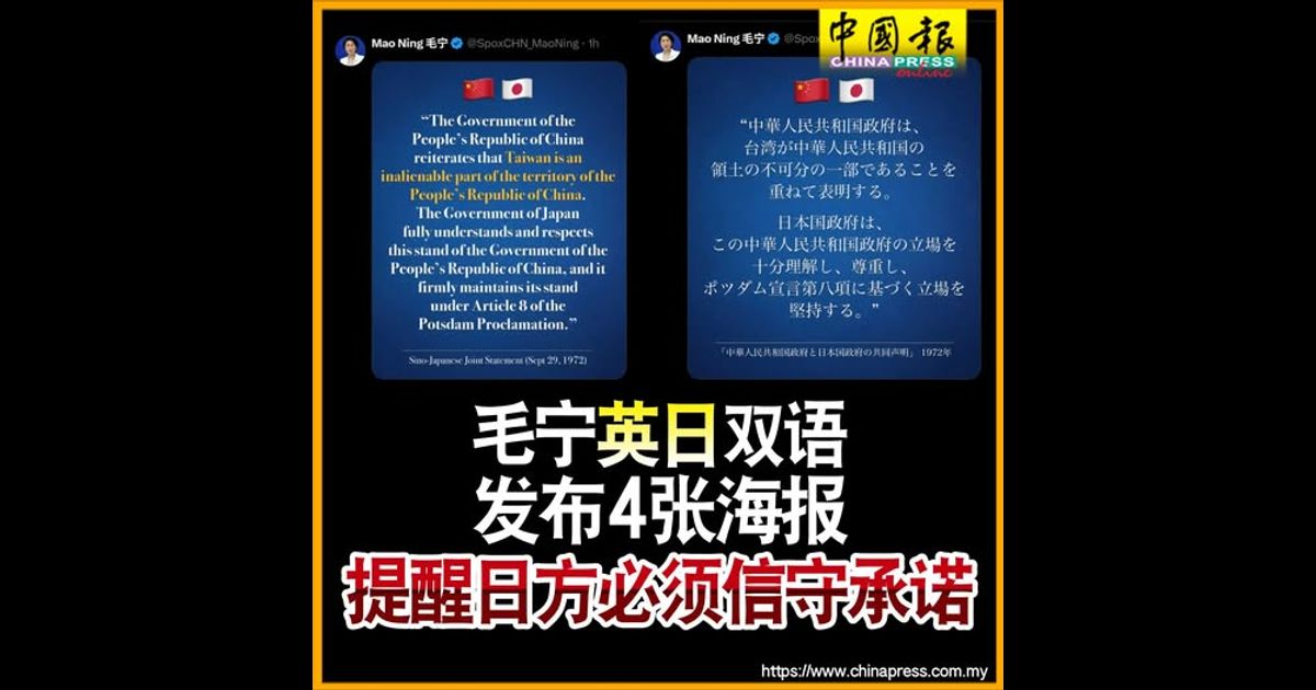 (北京16日综合电)中国外交部发言人毛宁周日(16日)在社交平台X上援引1972年《中日联合声明》中涉台内容,用英语、日语双语发布4张海报提醒日方“无论谁当政,日本都必须信守承诺”。