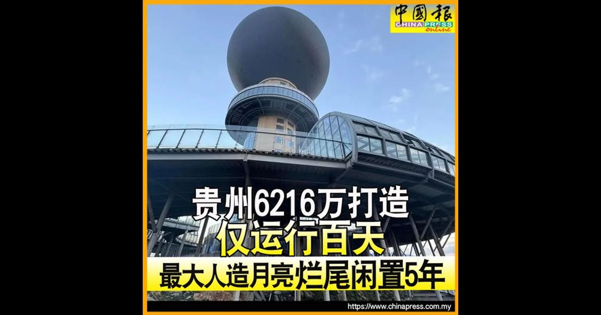 (北京16日综合电)中国贵州六盘水盘州市中央森林公园内的月亮山山顶,有一座高约100公尺、球体直径达40公尺、号称“全世界最大的人造月亮”,却在运营不足百日后便停运至今。 据报导,此“人造月亮”截至今年8月建设工程,总造价已超1.07亿元人民币(约6216万令吉)。