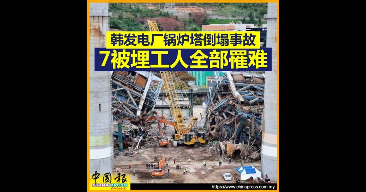 (首尔15日综合电)韩国东西电力公司蔚山火力发电厂本月6日发生锅炉塔坍塌事故,经过连日搜救后,周五晚找到最后一名失踪者并确认死亡。消防部门表示,现场7名被埋的工人至此确认全部罹难。