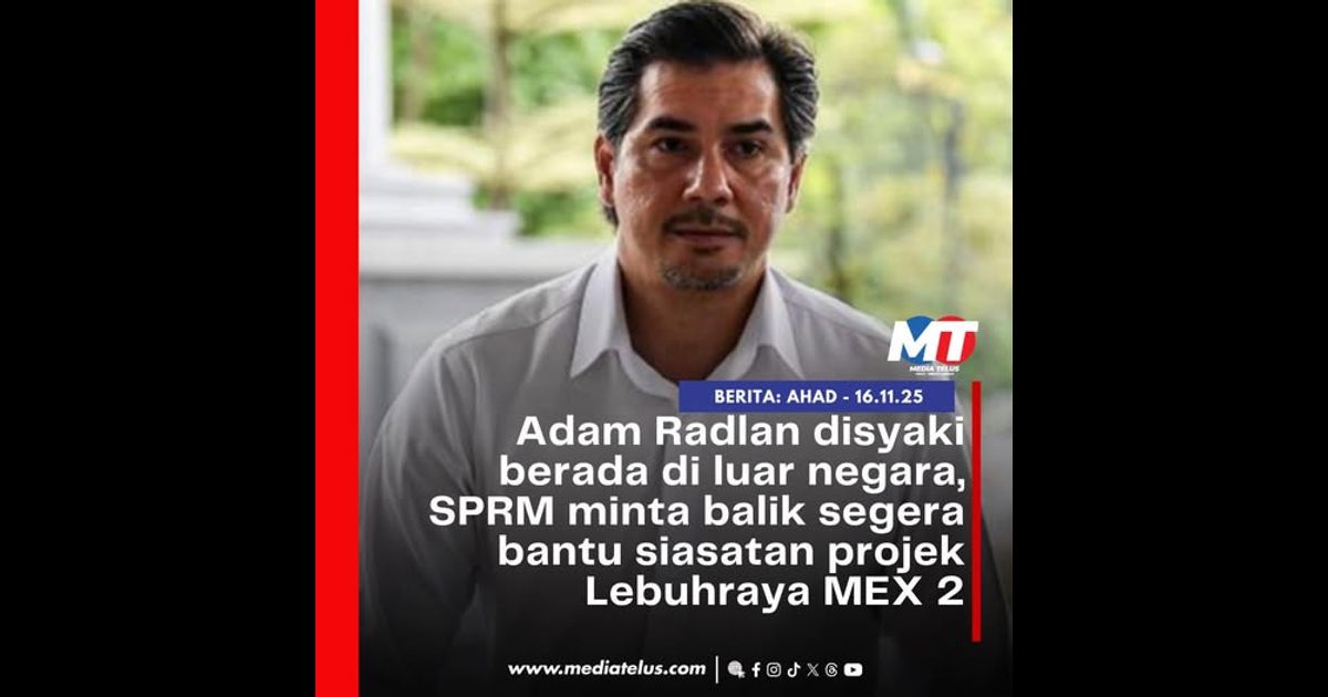 KUALA LUMPUR 16 Nov – Suruhanjaya Pencegahan Rasuah Malaysia (SPRM) percaya Timbalan Ketua BERSATU Bahagian Segambut, Adam Radlan Adam Muhammad, yang sedang dicari bagi membantu siasatan projek Lebuhraya MEX 2, berada di luar negara.
