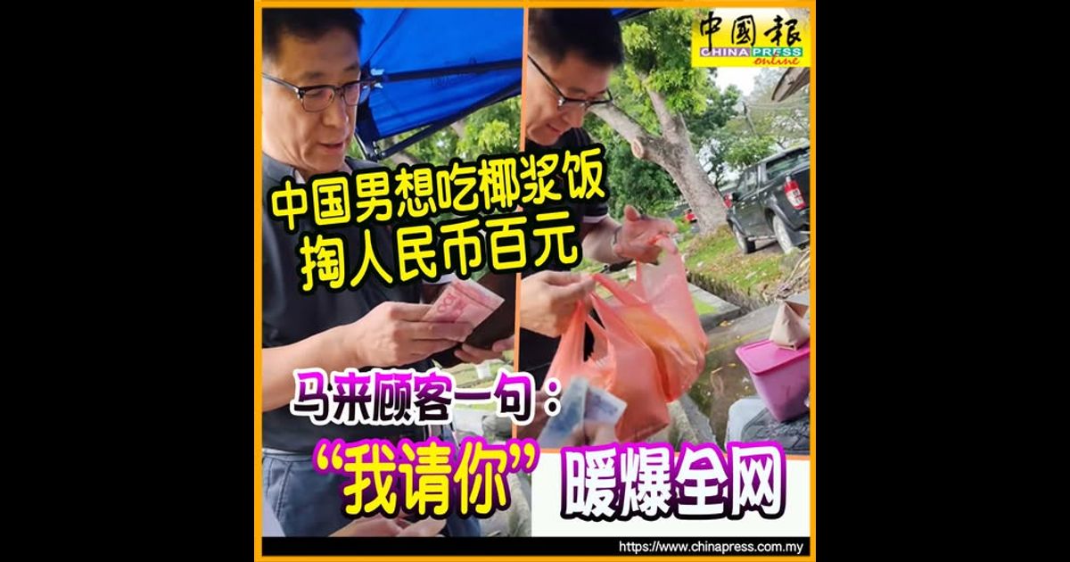 后来男子便掏出100元人民币(约58令吉46仙)以购买有关的椰浆饭,而剩余的零钱就会给椰浆饭小贩,对方却认为数额太大,希望他给数额较小的钱。