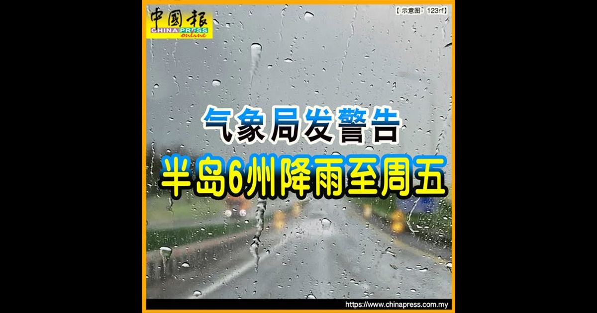 (吉隆坡17日讯)气象局发出警戒级别警告,半岛6个州属本周三(19日)料持续降雨至周五(19日至21日)。