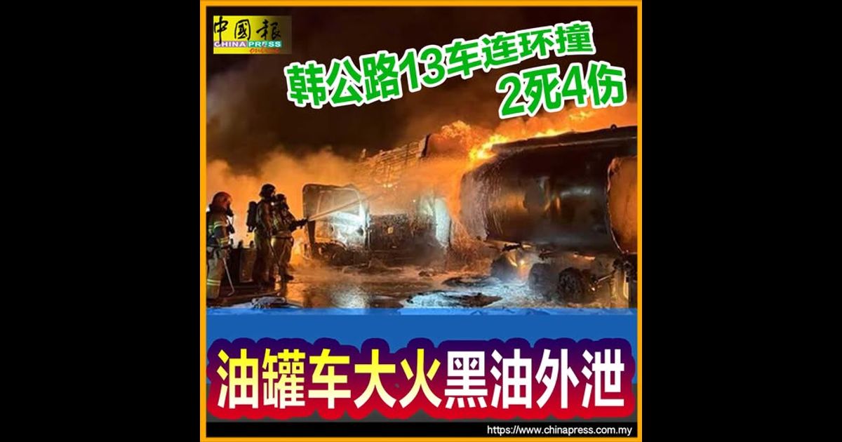 韩公路13车连环撞2死4伤 油罐车大火黑油外泄