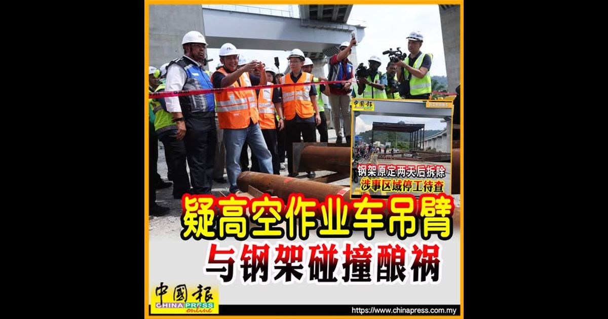 (吉隆坡19日讯)东海岸铁路计划靠近雪州峇都喼第二中环公路(MRR2)路段,昨天发生钢架倒塌事故,这起意外相信是检测油漆厚度的高空作业车吊臂与钢架发生碰撞所致。