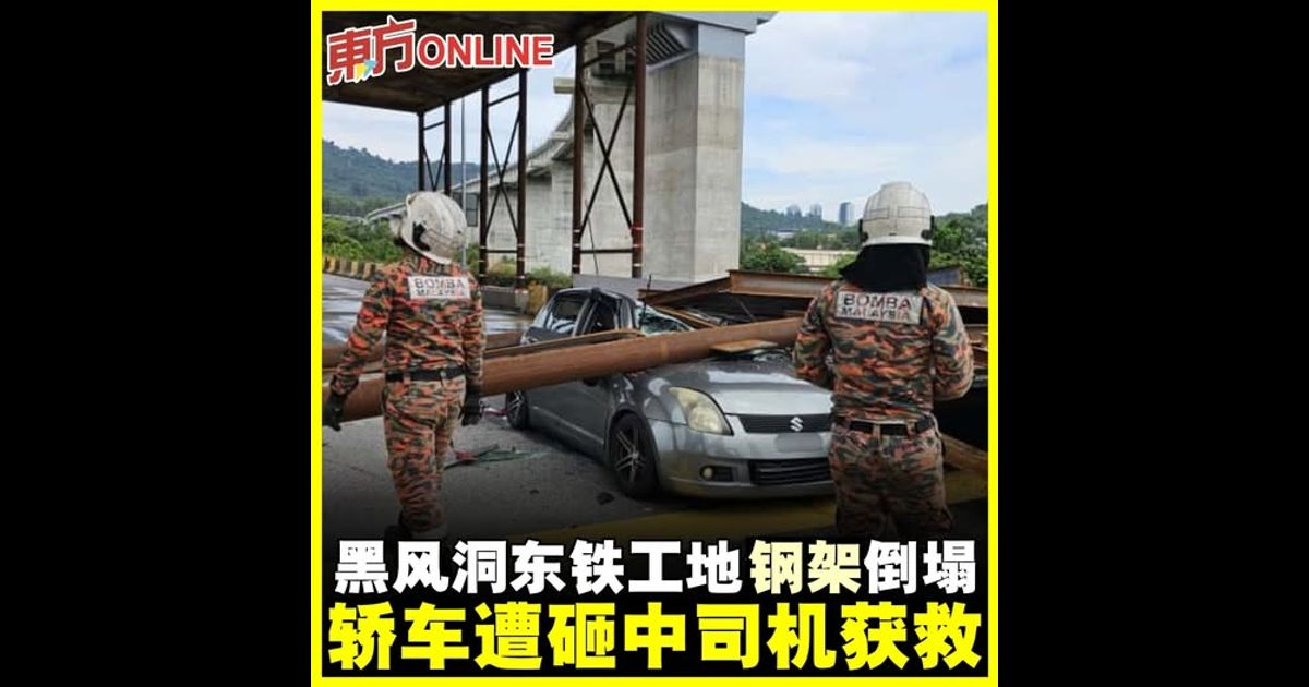 (吉隆坡18日讯)黑风洞东海岸铁路(ECRL)工地今日下午发生钢架倒塌事故,一辆轿车被砸中,车内一名女子在民众协助下脱困。