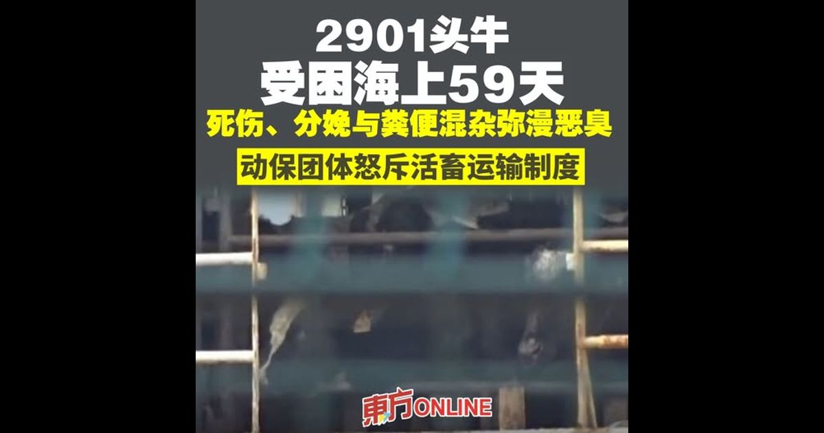 一艘载有2901头牛的多哥籍货船Spiridon II自9月20日从乌拉圭蒙得维的亚港启航,前往土耳其班迪尔马港,至今已在海上滞留59天。船上环境恶劣,牛只被迫挤在狭小舱房内,有动物死亡、分娩并与粪便混杂,弥漫恶臭,局势令人忧心。