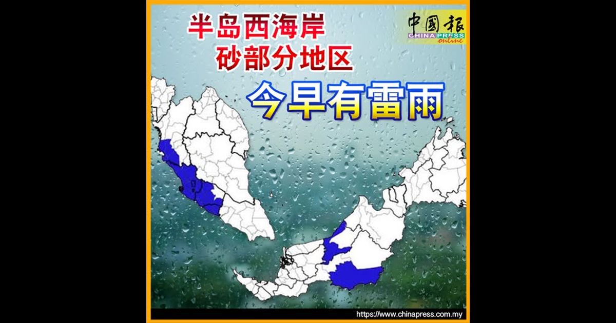 (吉隆坡20日讯)气象局预测,半岛西海岸一带与砂拉越部分地区将有雷雨,料持续到早上9时。
